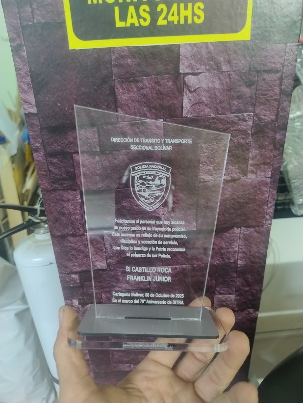 Distinción y sobriedad para ceremonias oficiales. Este diseño destaca por su técnica de grabado láser, que crea un acabado blanco mate permanente sobre el acrílico cristal, ideal para reproducir escudos, rangos y textos formales con total precisión.